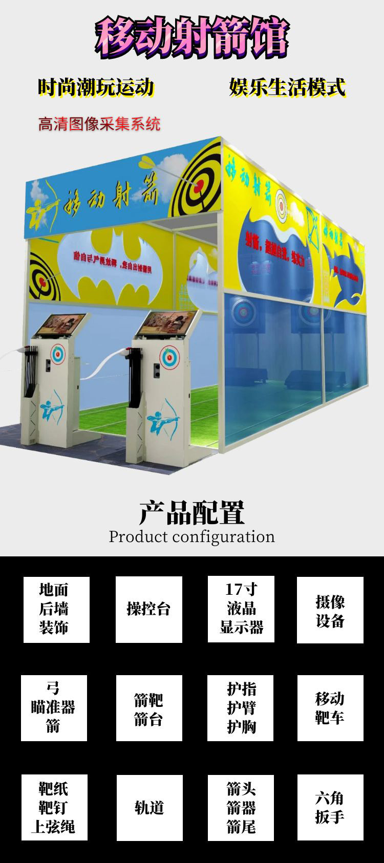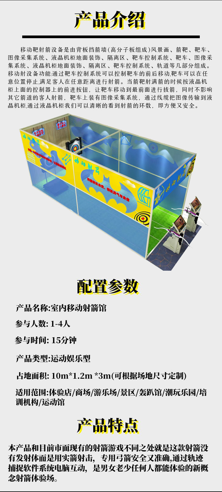 移动靶射箭馆是由背板挡箭墙(高分子板组成)风景画、箭靶、靶车、图像采集系统、液晶机柜地面装饰、隔离区、靶车控制系统、靶车、图像采集系统、液晶机柜地面装饰、隔离区、靶车控制系统、轨道等几部分组成。